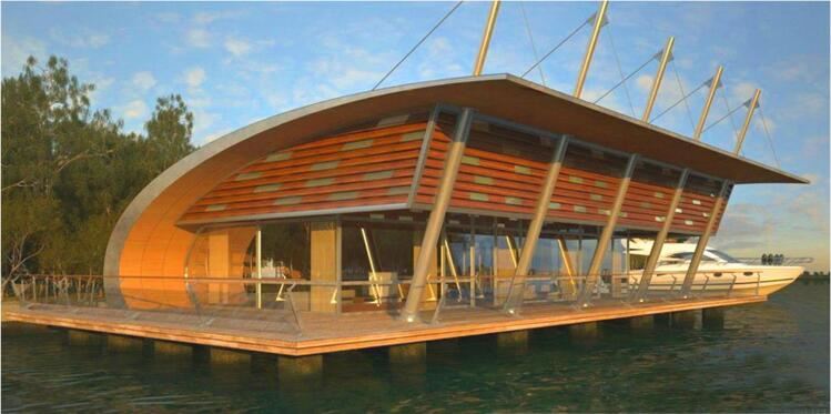 水上建筑設(shè)計適宜采用通透的建筑外殼,輕盈的建筑造型,因此該水上運(yùn)動中心建筑設(shè)計采用現(xiàn)代風(fēng)格,采用鋼架結(jié)構(gòu)的形式,建筑材料專用采用鋼構(gòu)架、防腐木和玻璃,屋頂設(shè)計采用流線型,挑出屋頂?shù)闹雍弯摻z拉線與現(xiàn)狀水上高爾夫的張拉膜結(jié)構(gòu)形成統(tǒng)一風(fēng)格。