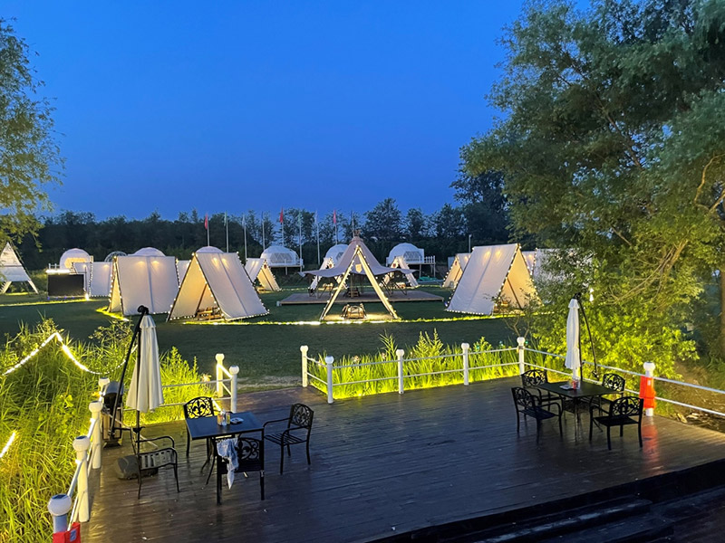 此區(qū)塊位于規(guī)劃地塊的東北角濱水區(qū)塊,該區(qū)塊項(xiàng)目設(shè)計意在配合度假酒店,加載精品化的休閑度假項(xiàng)目,打造精品度假體驗(yàn)。其主要內(nèi)設(shè)項(xiàng)目包括垂釣俱樂部、房車營地、篝火廣場、精品帳篷酒店、帳篷餐廳和露天燒烤園等等